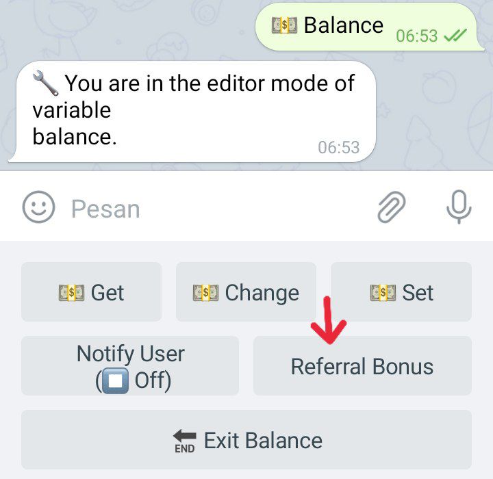 Info: Dalam kata lain kamu sudah berhasil membuat dan mengatur bonus referral pada Menu builder bot, maka selanjutnya adalah apakah bonus referral tersebut berfungsi secara otomatis, tidak ada yang tau sebum kita mencoba